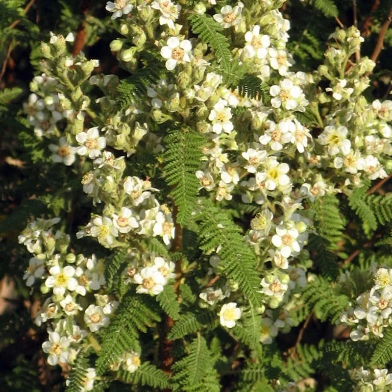 Chamaebatiaria millefolium (Fernbush) is a beautiful native shrub that brightens the garden in mid-summer with big clusters of bright white flowers. It also has attractive dried seed heads and olive-green foliage. Drought resistant perennial plant (xeric).