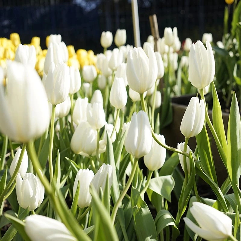 20-24“ tall x 4“ wide. Hakuun Darwin Tulip lights up the mid-spring garden with pure white flowers that shine brightly. Plant en masse for sweeping color, or sprinkle as highlights through a multi-colored spring flower display – white flowers are beautiful wherever they are planted. Hakuun is a Darwin hybrid Tulip with giving it strong stems, so it can tolerate spring‘s breezes. It‘s also a perennial tulip and it will reliably return with beautiful flowers for up to 5 years. To help bulbs recharge each season, leave foliage in place until after it‘s yellowed. Pair Hakuun with delphinium, oriental poppies, bearded iris, or peonies for a striking display. Plant them in well-drained soil in a sun to light–shade location, 5“ deep, in groups of at least 3-5 for best effect. Beautiful as cut flowers too, so plant plenty. Bumblebees and honeybees love the arrival of tulip pollen in spring, making them an important member of a pollinator–friendly garden.