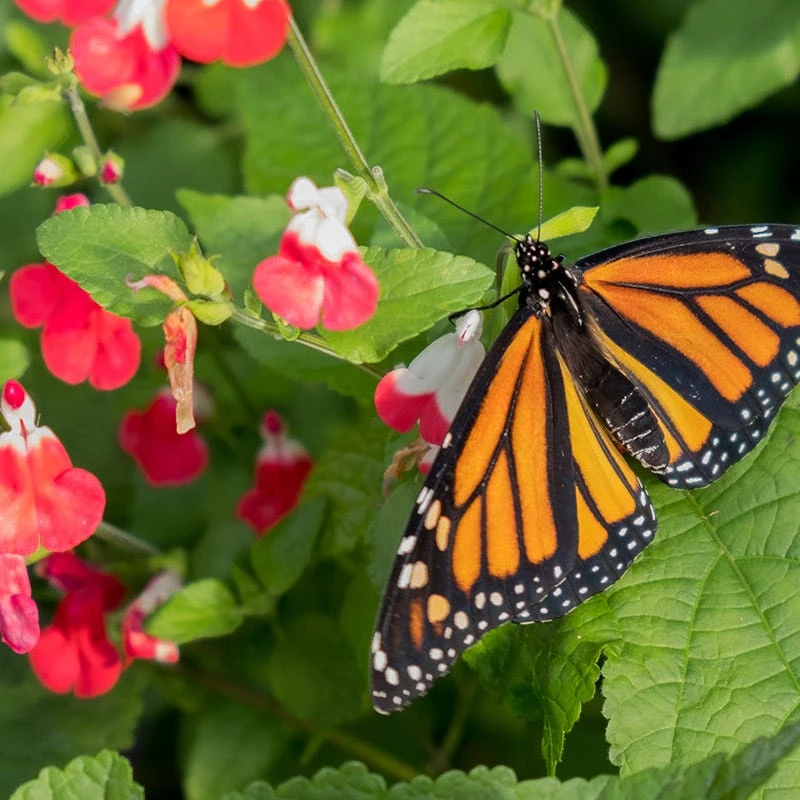 Salvia microphylla ‘Hot Lips’ (Littleaf Sage) has distinctive, brilliantly colored flowers that make ‘Hot Lips’ Salvia a special selection. Blooming from spring until hard frost in fall, the flower color will vary seasonally. In the cooler times of spring and fall, the flowers are strongly bi-colored red and white. When it’s hot, the flowers go solid red. Regardless of the time of the growing season, this ever-blooming selection is a beauty. The plant makes a small shrub with age and thrives in poor soils with plenty of heat and sun. Plant with Lavender (Lavandula) and white Appleblossom Grass (Gaura). Javelina resistant