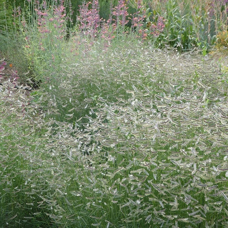 Bouteloua x ‘Zig Zag’ (Blue Grama Grass) blooms with a profusion of horizontal eyebrow-like flowers in mid-summer. The flowers ripen to a light tan color, curl upward on the flower spike, and hold on the plant through winter, providing months of flowers and seed heads. Discovered by High Country Gardens Chief Horticulturist, David Salman, growing in Santa Fe, NM.